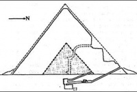 Как увидим позднее, числа 6 и 8 имели большое религиозно-символическое значение в Древнем Египте, а их сумма — 14 также встречается в Гизе (угол насыпных дорог). Угол наклона нижнего хода Второй пирамиды (21°40?) составляет половину угла наклона пирамиды, основанного на величине 3 ?, а значит, строители могли быть знакомы с соотношением 4 ?, использованным в Великой пирамиде. Угол этого заброшенного входа может свидетельствовать о том, что строители Второй пирамиды намеревались первоначально соорудить менее крутую пирамиду с углом, построенным на величине 3 ?. Затем они несколько изменили направление, которое более соответствовало расположению естественной гряды, идущей вдоль ограждения Сфинкса к Храму долины. В то же время новый, более крутой угол наклона, содержал числа 6 и 8. Новый входной коридор Второй пирамиды составлял 25°55?, половину угла наклона Великой пирамиды 51°50?. Строители словно опасались создать откровенную копию первой, более ранней, пирамиды.